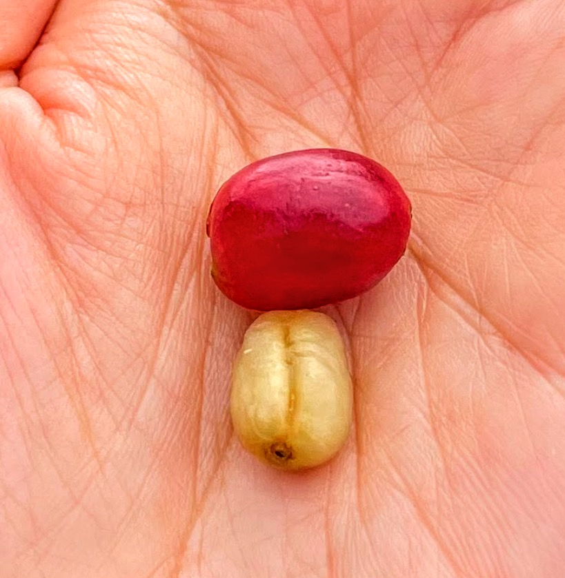 When a coffee tree bears fruit, it produces a ripe red cherry usually consisting of two portions on the inside. These portions, or seeds grow into coffee beans. As there are two and they are in a round cherry, we get the typical shaped coffee bean. Rounded on the outside and flat on the inside. Very rarely, in only about 2-3% of cherries, one seed never develops. So from the single seed, we end up with an individual small round circular bean. This is a PEABERRY.